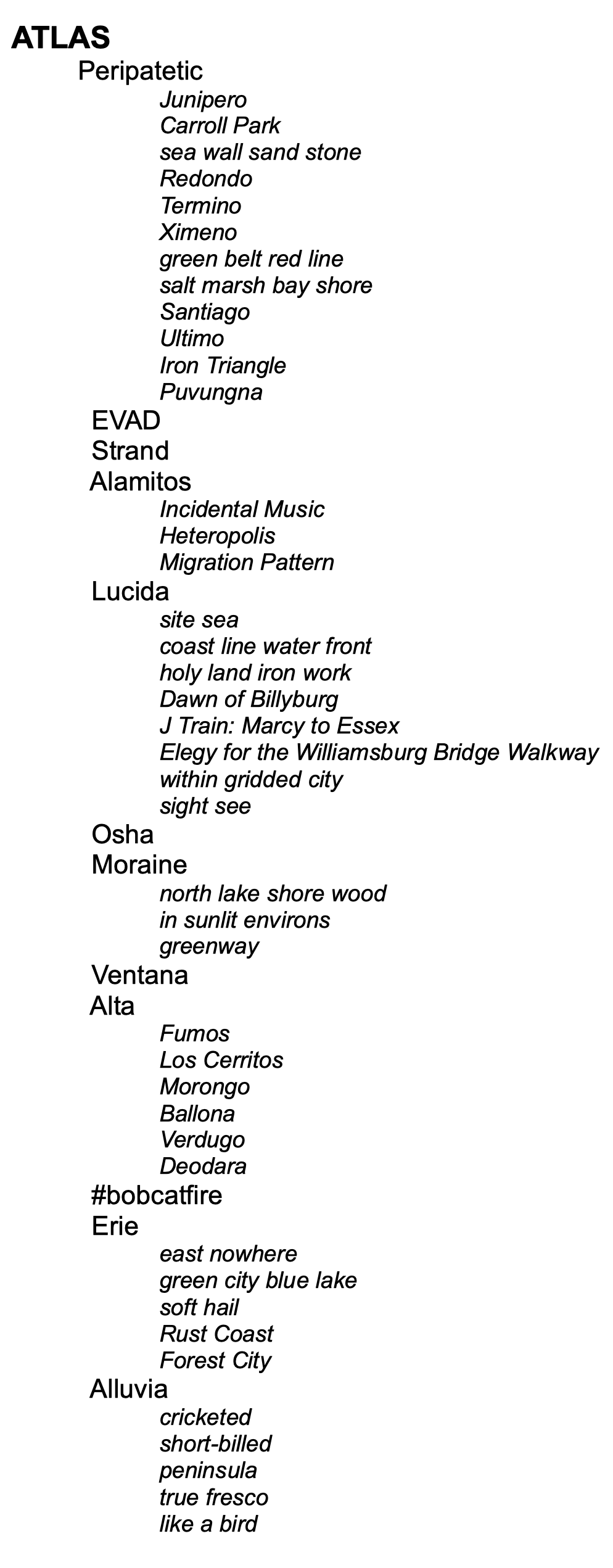 The telling of the Atlas idea has been the practice of change. Its form is manifold: Atlas is a long poem; Atlas is a sequence of poems; Atlas is an arrangement of texts with carefully considered line breaks. Atlas is a map that refers to, depends on, other maps.