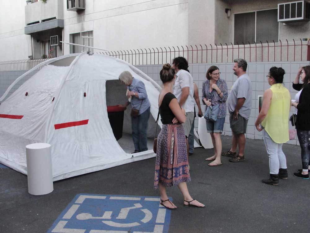 Nakagawa. We’re just taking baby steps toward what we hope will be a bigger installation. For Soundwalk it’s First in Space: The Ride. That’s what the series is called, First in Space, for obvious reasons. The installation will be a modified tent, a dome tent, in the vernacular of a spaceship, the capsule. So, you walk into the capsule, you sit in a cockpit kind of thing, and then watch these images projected on the side of the tent. You put your helmet on, which has a microphone. The whole thing is an animation that moves forward by voice-recognition software. We are working on this footage that we created: a fictitious reenactment of what we think it might have been like to be one of these dogs. Your experience, through voice recognition, will be as if you are traveling through this space launch.